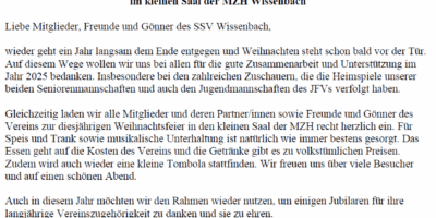 Aktuelles Jahreshauptversammlung 2024 Veröffentlicht von Julian Schild am 20. Januar 2024 Weitere Artikel → Aktuelles Weihnachtsfeier 2025 Aktuelles Oktoberfest am 20.09.2025 Aktuelles Feriencamp SSV Wissenbach vom 07.10. bis 11.10.2025 Julian Schild Weitere Artikel → Aktuelles Weihnachtsfeier 2025 Aktuelles Oktoberfest am 20.09.2025 Aktuelles Feriencamp SSV Wissenbach vom 07.10. bis 11.10.2025